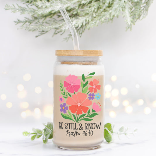 Be Still and Know Glass Can 16oz, Psalm 46:10 Christian Cup, Faith Based Iced Coffee Glass